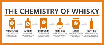 몰팅(Malting) - 매싱(Mashing) - 발효(Fermentation) - 증류(Distillation) - 오크통 담기 - 숙성(Aging) - 병입(Bottling)